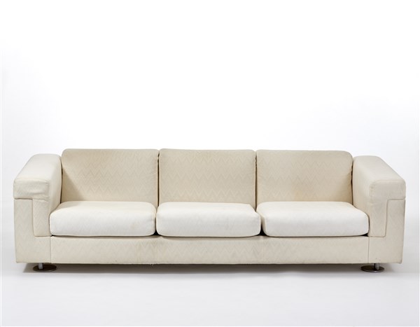 Divano a tre posti modello "D120". Produzione Tecno, Varedo, 1966. Rivestimento in tessuto creme, piedini in acciaio cromato. (cm 221x58x81) (lievi difetti e restauri)