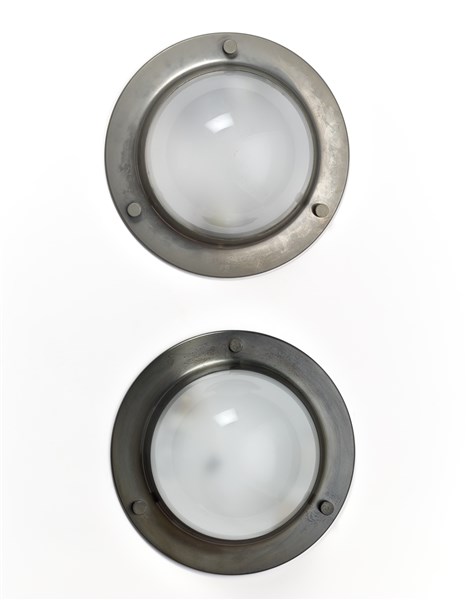 Lotto di due plafoniere-appliques modello "LSP6 Tommy". Produzione Azucena, Milano, 1965. Struttura in ottone brunito e nichelato, paralume in vetro smerigliato internamente. (d cm 36) (lievi difetti)