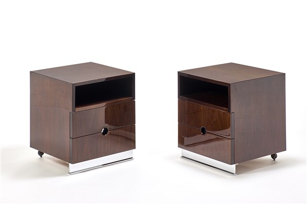 Coppia di comodini a due cassetti con piano a giorno. Produzione Azucena, Milano, anni '70. Legno di mogano massello, bordato e impiallacciato con inserti e veletta anteriore in metallo cromato. Due rotelle posteriori. (cm 50x57,5x50) (lievi difetti)