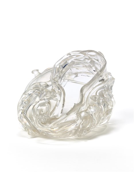 Vaso informale in vetro cristallo opalescente con applicazioni a fili irregolari. Murano, 1997. Pezzo unico. Firmato e datato sotto la base. (h cm 19)