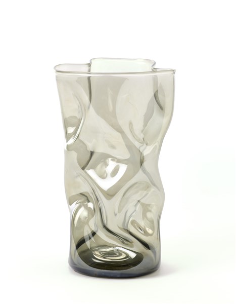 Vaso a cartoccio in vetro soffiato trasparente grigio iridato sulla superficie esterna. Murano, anni '70/'80. Etichetta adesiva della manifattura sotto la base. (h cm 24,5)