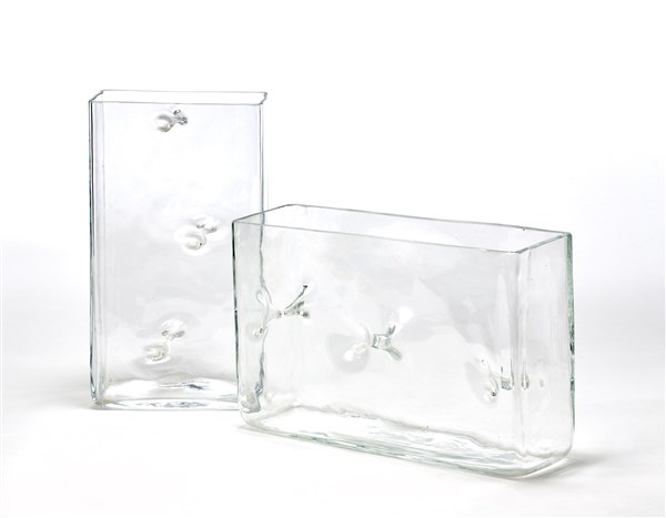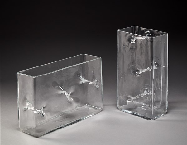 Lotto composto da due vasi parallelepipedi della serie "Repetai". Esecuzione F.lli Toso, Murano, 1968. Vetro cristallo soffiato in stampo con pareti interconnesse da membrane passanti. (cm 16x29x9; cm 31x19,5x9,5)