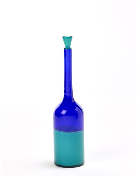 Bottiglia con tappo della serie "Incalmi". Murano, 1982. Vetro azzurro e blu a incalmo. Firmata e datato a punta sotto la base. (h cm 31)