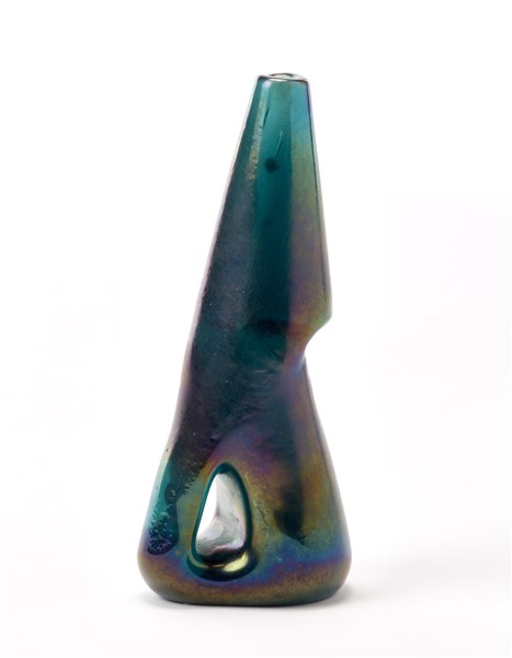 Piccolo vaso soliflore con corpo troncoconico irregolare forato alla base della serie "Anse volanti". Esecuzione Avem, Murano, anni '50. Vetro soffiato verde trasparente fortemente iridato sulla superficie esterna. Disegno n 0546 del catalogo fotografico di fornace. (h cm 16)