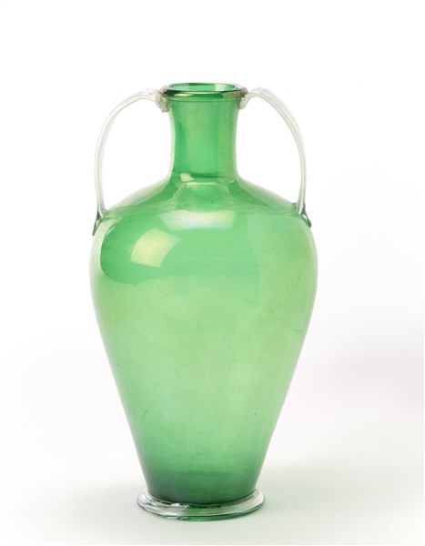 Manifattura di Murano Vaso biansato in vetro soffiato trasparente verdino. Anse