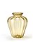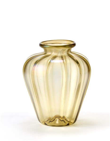 Vaso in vetro soffiato pagliesco con corpo a costolature a stampo, superficie esterna iridata. Prima metà secolo XX. (h cm 23)
