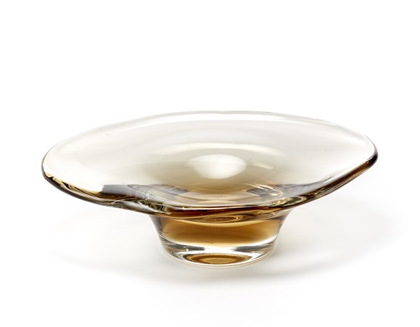 Coppa a corpo asimmetrico in vetro sommerso cristallo e pagliesco. Murano, anni '50. Disegno n. 2823 del Catalogo Blu Venini. Firmato ad acido "venini murano ITALIA". (l cm 22)