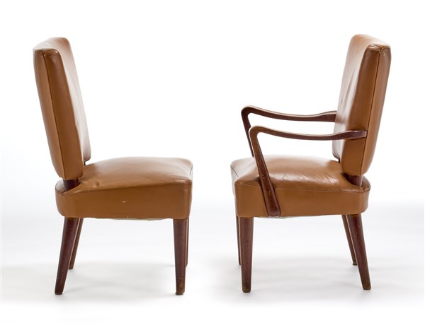 Lot composed of an armchair and a chair. Italy, 1940s. Structure in oak wood, seat and back upholstered and covered in brown skai. (armchair 56x95x58 cm; chair cm 52x95x58) (slight defects and minor restorations)
