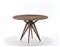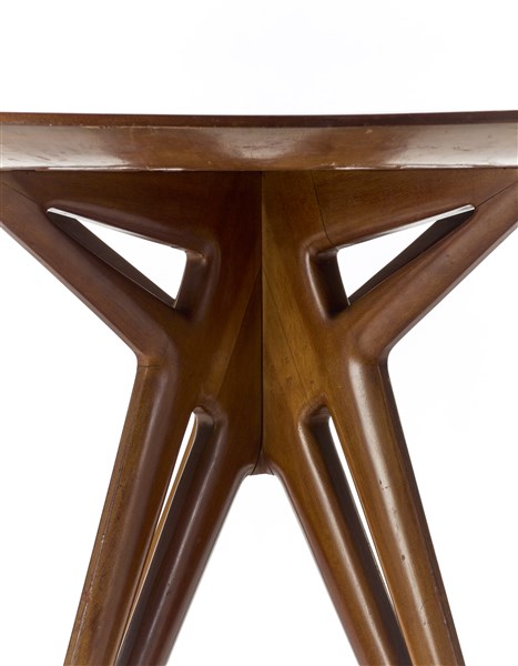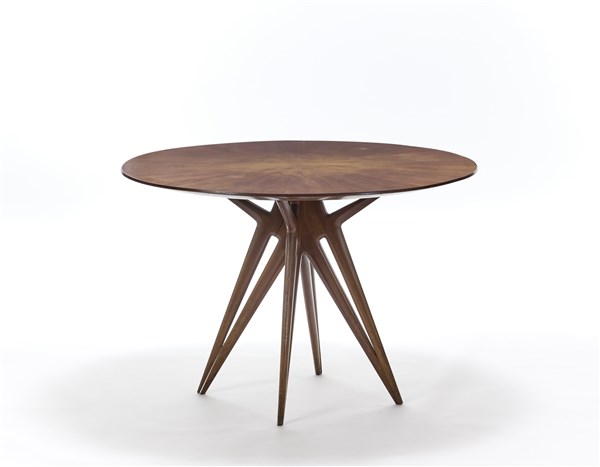 Round table with structure in solid mahogany and veneer, four double fork legs. Italy, 1950s/1960s. (h 81 cm.; d 119 cm.) (slight defects)