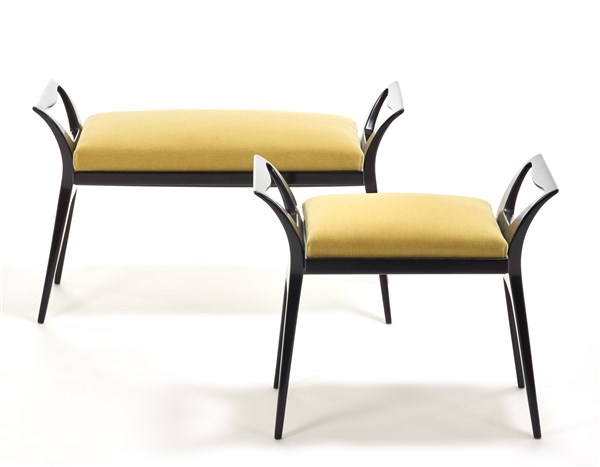 Lotto di due panche in legno di noce ebanizzato con rivestimento in velluto di seta giallo. Italia, 1948ca. (cm 101x59x38; cm 72x59x33)