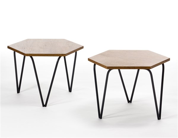 Due tavolini esagonali. Produzione ISA, Ponte San Pietro, anni '50. Piano il legno impiallacciato, struttura in tondino di metallo verniciato nero. Recanti etichetta della produzione sotto il piano. (cm 58x40,5x50,5) (lievi difetti)