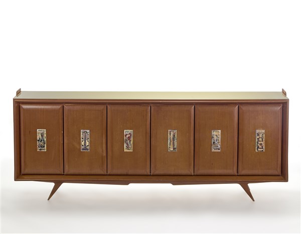 Credenza nello stile di Ico Parisi in legno impiallacciato con ante decorate da ceramiche di Teodoro Russo. Italia, anni '50. (cm 266x103,5x46) (lievi difetti)