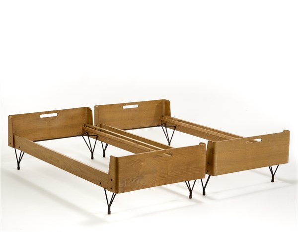 Coppia di letti singoli. Italia, anni '50. Struttura in legno curvato e compensato, piedini in tondino di acciaio verniciato nero. (cm 195x53x93) (lievi difetti)