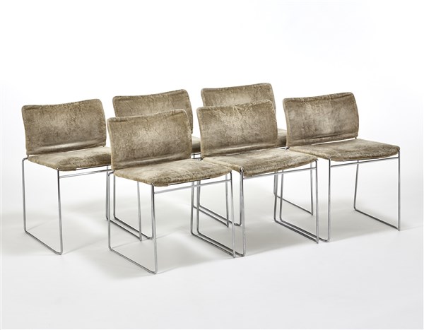 Lotto composto da sei sedie modello "Jano". Produzione Simon Gavina, San Lazzaro di Savena, 1968. Struttura in acciaio, rivestimento della seduta e dello schienale in velluto verde/grigio. Recanti etichetta adesiva del produttore sotto la seduta. (cm 51x69x52) (difetti)