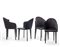 Quattro sedie modello "Tuscana". Produzione Saporiti, Italia, 1986. Legno laccato nero, multistrato curvato e rivestito in velluto nero, seduta in pelle. (cm 46x84x53) (lievi difetti)