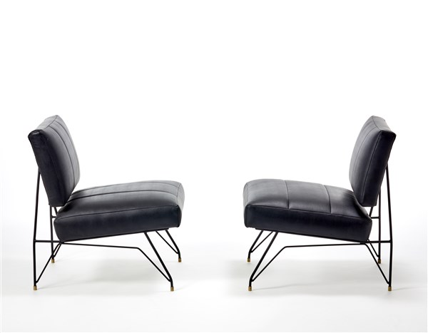 Coppia di poltrone con struttura in tondino di acciaio verniciato nero e rivestimento in similpelle nera. Italia, anni '60. (cm 60x66,5x71) (lievi difetti)