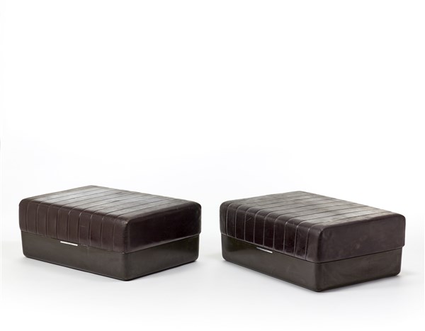 Lotto composto da due pouf della serie "Container". Produzione Giuseppe Rossi Albizzate, Albizzate, anni '70. Scocca in plastica nera e seduta in similpelle nera. Recanti etichetta della produzione. (cm 101x40x70) (difetti)