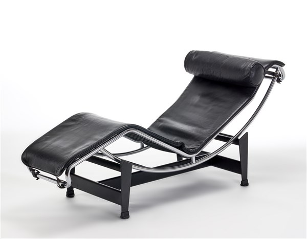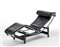 Chaise longue modello "LC4". Produzione Cassina, Meda, disegno del 1928, esemplare degli anni '70. Struttura in tubolare metallico cromato, telai in metallo laccato nero, rivestimento in pelle nera. Firma e numerale incussi sulla struttura metallica. (cm 180x67x57) (lievi difetti)