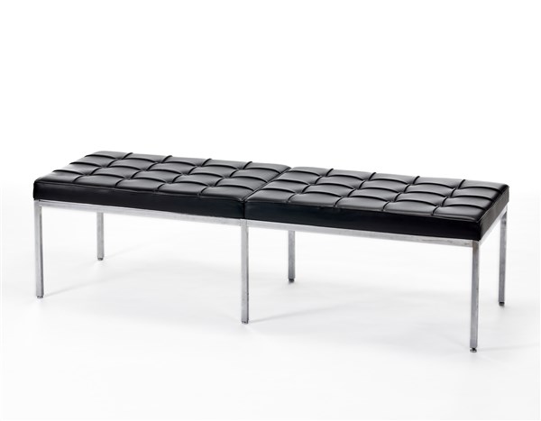 Panca. Produzione Knoll, USA, disegno del 1954, esemplare degli anni 70. Struttura in acciaio cromato, seduta imbottita e rivestita in pelle nera. (cm 152x40,5x50)