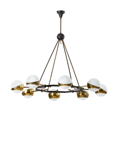Lampada a sospensione a otto luci con struttura in metallo verniciato nero e ottone, diffusori globulari in vetro incamiciato lattimo. Italia, anni '60. (h cm 78; d cm 90) (lievi difetti)