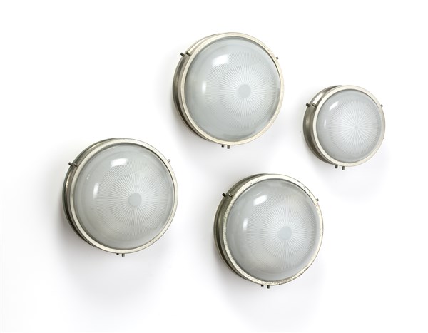 Lotto di quattro plafoniere modello "Sigma". Produzione Artemide, Milano, anni '60. Ottone nichelato, vetro stampato e metallo laccato bianco. (d cm 20; d cm 26) (lievi difetti)