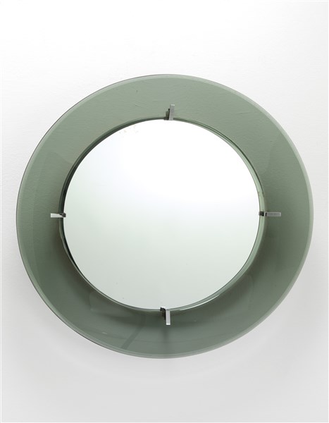 Specchio con cornice in cristallo fumé, struttura in metallo cromato. Italia, anni '70. (d cm 68)