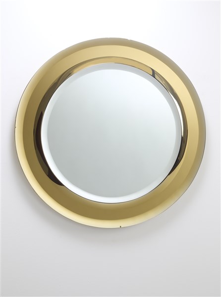Large circular mirror. Milan, 1960s/1970s. Mirrored bevelled rosambé glass frame. (d 92 cm.) (slight defects)