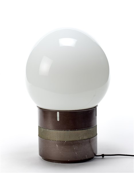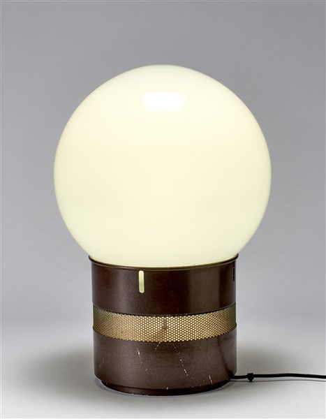 Lampada da tavolo modello "Mezzoracolo". Produzione Artemide, Milano, 1969. Struttura tubolare in metallo verniciato e acciaio forato, grande paralume a globo in vetro incamiciato lattimo. (h cm 66; d cm 45) (lievi difetti)