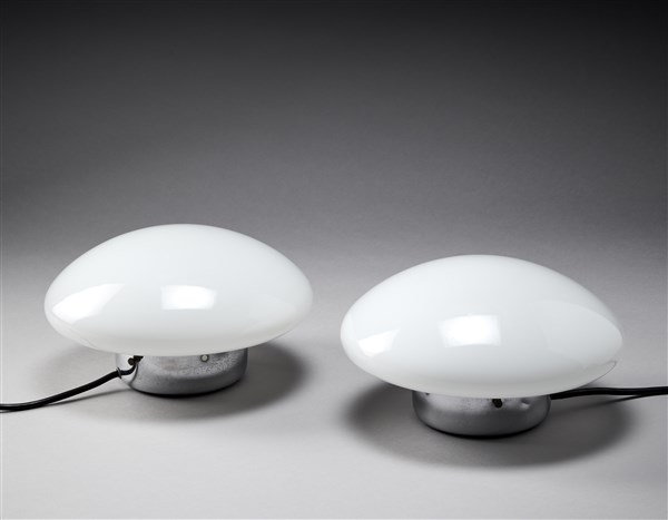 Coppia di lampade da tavolo modello "Magnolia". Produzione Quattrifolio, Milano, 1971. Base in metallo cromato, diffusore in vetro lattimo. (h cm 14,5; d cm 25)