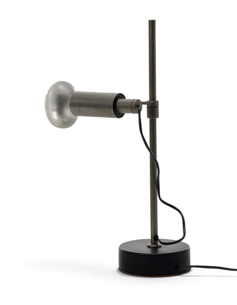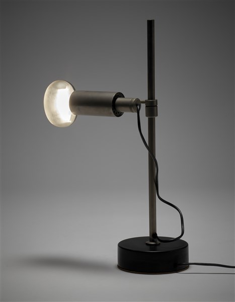 Lampada da tavolo con struttura in metallo nichelato e alluminio, base in metal