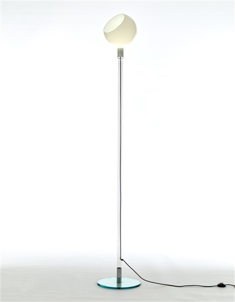 Lampada da terra modello "Parolona". Produzione Fontana Arte, Milano, anni '80. Diffusore in vetro soffiato incamiciato lattimo, stelo e base in cristallo. Segnalazione al Compasso d'Oro del 1981. (h cm 190) (difetti)