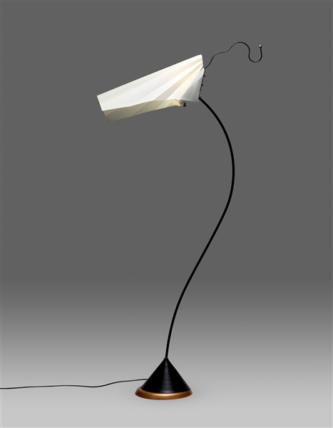 Lampada da terra modello "Sister". Produzione O-Luce, Milano, 1991. Base in metallo verniciato nero, diffusore in pergamenoide. (h cm 183) (lievi difetti)