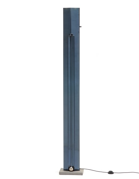 Lampada da terra modello "Totem". Produzione Simon Gavina, San Lazzaro di Savena, anni '80. Acciaio brunito, pietra serena, metallo cromato. (h cm 181) (difetti)