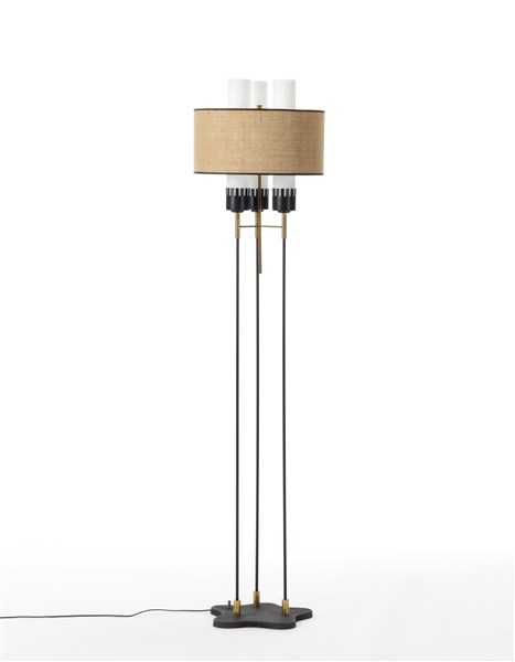 Lampada da terra a tre luci con struttura in metallo verniciato nero e ottone, diffusori in vetro lattimo, paralume in tessuto di canapa intrecciato e base in fusione metallica verniciata nera. Italia, anni '50. (h cm 168) (lievi difetti)