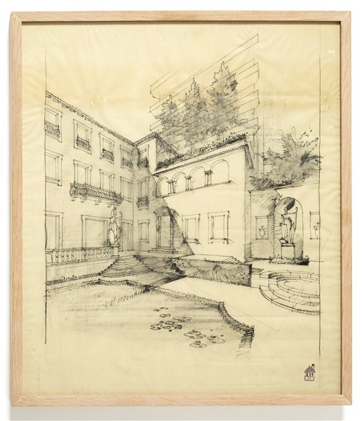 Project for the restoration of the Ghisio house in Milan. Perspective sketch of the courtyard. Milan, 1953/1958. Drawing on tracing paper, pencil and India ink; Pad stamp with cartouche from Piero Portaluppi's studio and numbering 879-11. (52x44.5 cm). In frame. (defects)