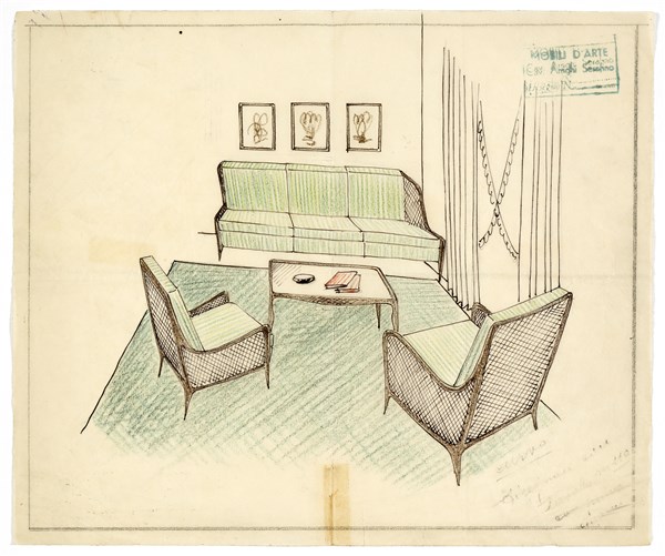 Perspective sketch depicting a low table, two armchairs and a sofa in wood and rattan. Milan/Cantù, 1940s/1950s. Pencil, India ink and colored pastels on tracing paper. On the cartouche "Mobili d'Arte Cav. Arrighi Stefano". (27x32.2 cm.) (slight defects)