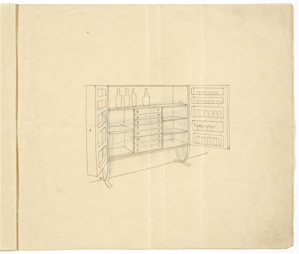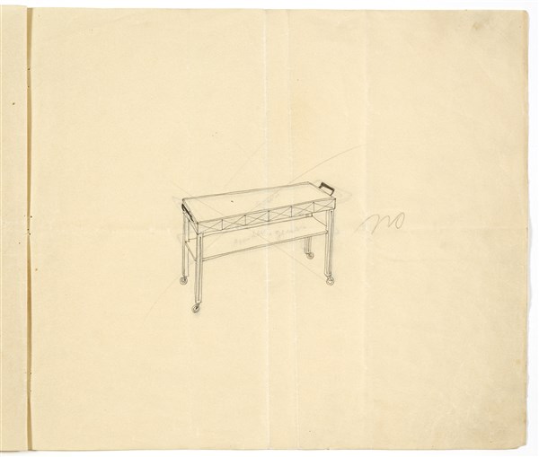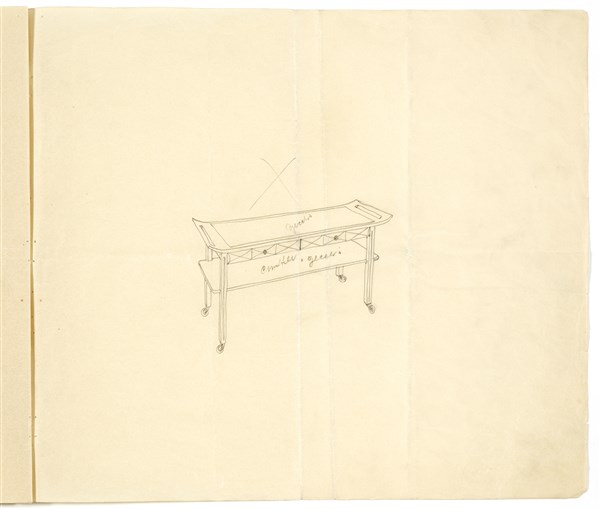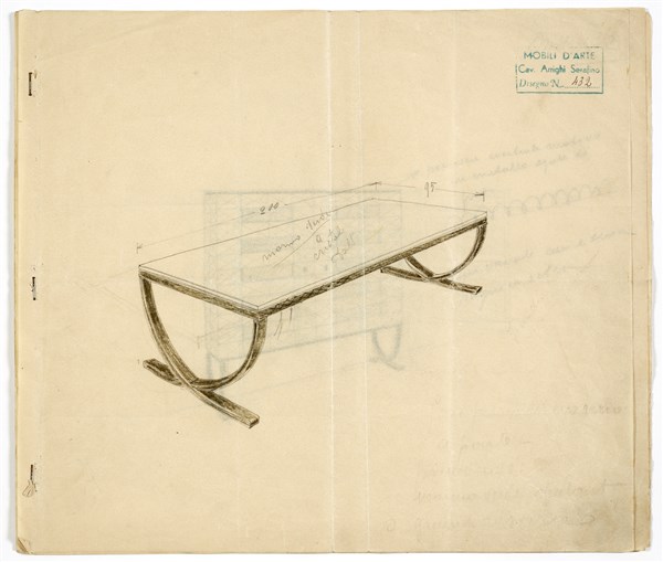 Lot consisting of a booklet containing five sheets with project drawings representing respectively a table with a green marble top, a bar cabinet with glass bosses and a two-shelf trolley with removable upper tray. Milan/Cantù, 1940s/1950s. Pencil on dusting paper. On the cartouche "Mobili d'Arte Cav. Arrighi Stefano". (29.7x34.5 cm.) (slight defects)