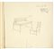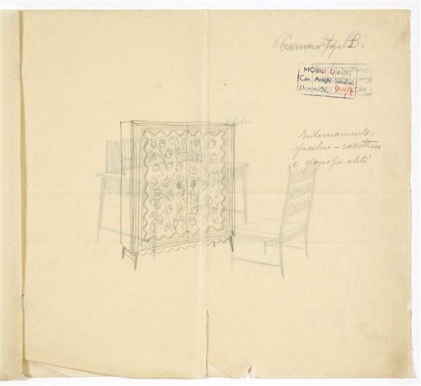Drawings on three sheets for the furnishing of a bedroom, consisting of bed and bedside table, wardrobe, desk with chair of three sheets with drawings of. Milan/Cantù, A40. Pencil on dusting paper. On the cartouche "Mobili d'arte Cav. Arrighi Serafino". (29.8x32.3 cm.) (defects)