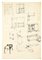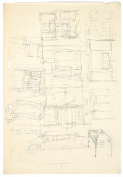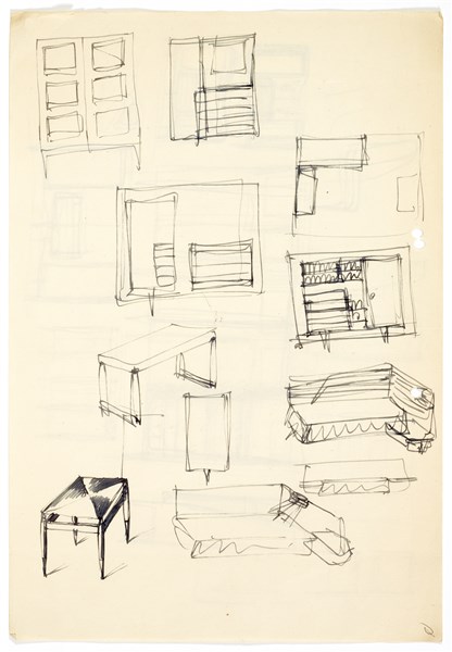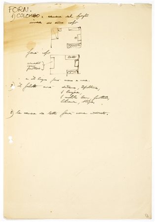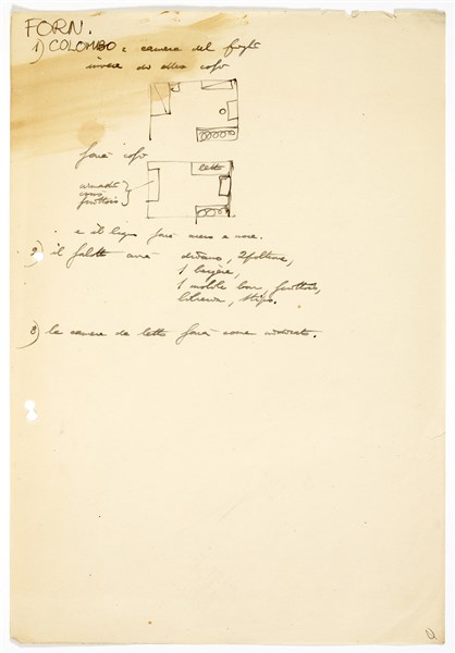 Studies on two sheets for the furnishing of a bedroom to be made by the cabinetmaker Ariberto Colombo. Milan, 1940s. Pencil and black ink on paper. Handwritten annotations by Gio Ponti. Front / back. (31.9x21.9 cm.) (slight defects)