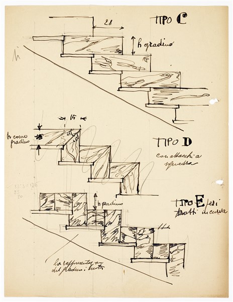 Two studies respectively for baluster stairs in Xantal and for three types of stairs, probably for the Montecatini palace in Milano. Milan, 1935ca. Pencil and black ink on paper. Handwritten annotations by Gio Ponti. Front / back. (28.2x28.1 cm.) (slight defects)