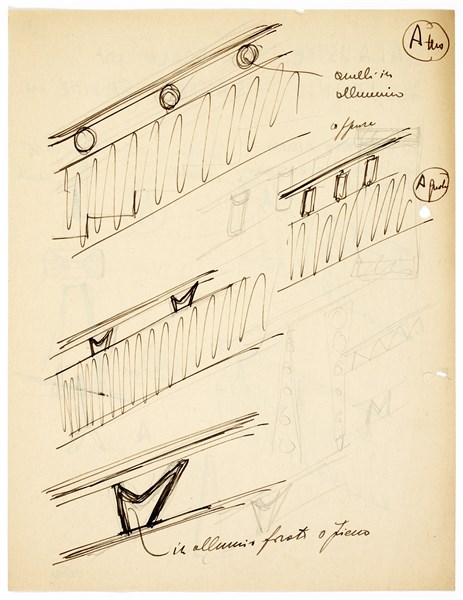 Due studi rispettivamente per balustre scale in Xantal e per tre tipologie di scale, probabilmente per il palazzo Montecatini a Milano. Milano, 1935ca. Matita e inchiostro nero su carta. Annotazioni manoscritte di pugno di Gio Ponti. Recto/verso. (cm 28,2x28,1) (lievi difetti)