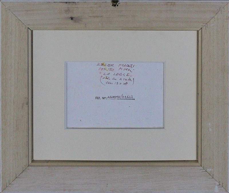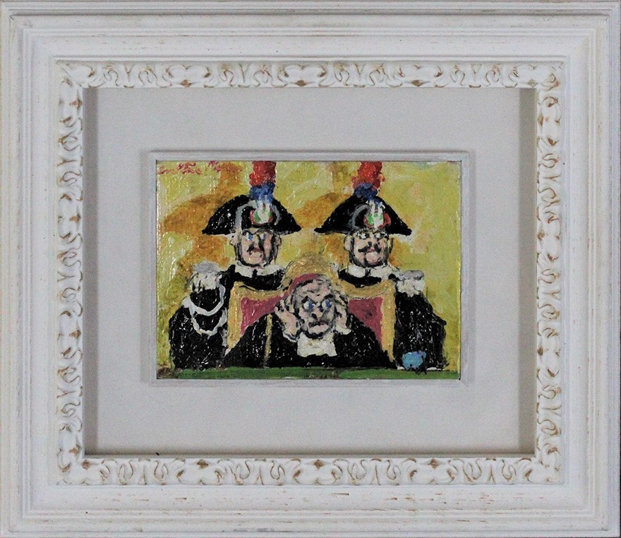 VALTER PIACESI, "La legge", Anni 2000, Olio su tavola, Dim. 13x18, Opera accompagnata da certificato di autenticità, Al fronte: firmato in alto a sinistra, Al verso: N° di archivo, titolo e firma, Opera con cornice