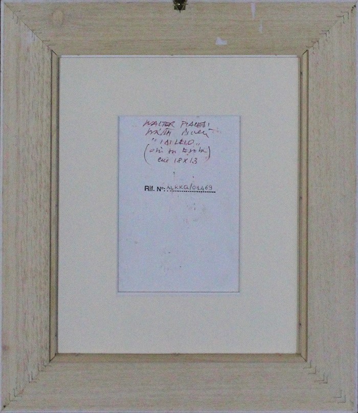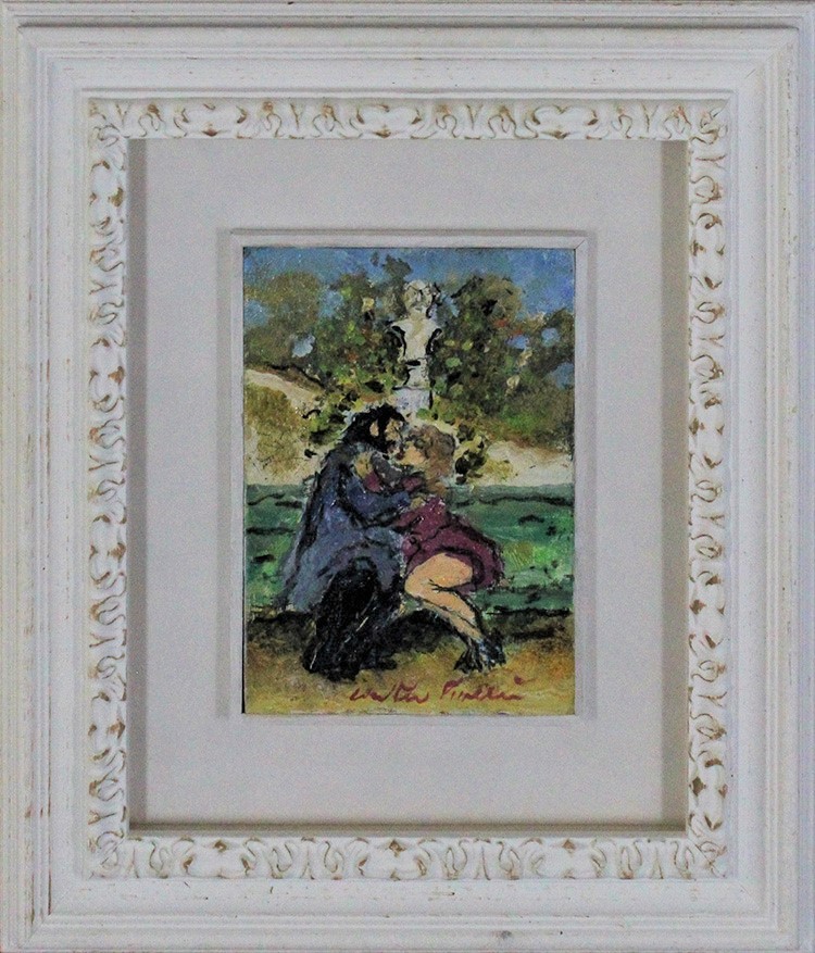 VALTER PIACESI, "Idillio", Anni 2000, Olio su tavola, Dim. 18x13, Opera accompagnata da certificato di autenticità, Al fronte: firmato in basso a destra, Al verso: N° di archivo, titolo e firma, Opera con cornice