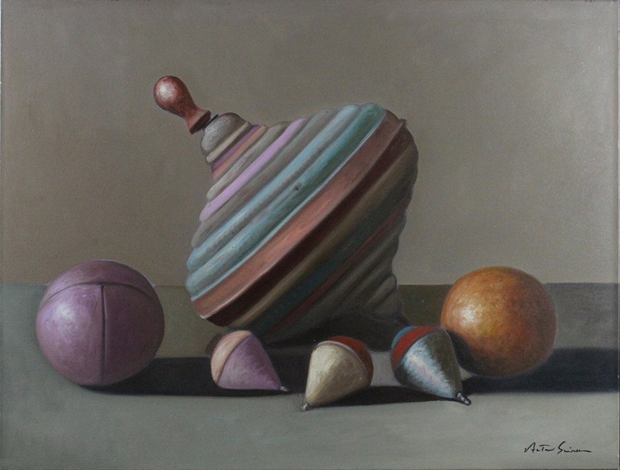 ANTONIO SCIACCA, "Le trottole", Anni 2000, Olio su tela, Dim. 65x90, Opera accompagnata da autentica su foto dell'artista, Al fronte: firmato in basso a destra, Al verso: autentica del maestro