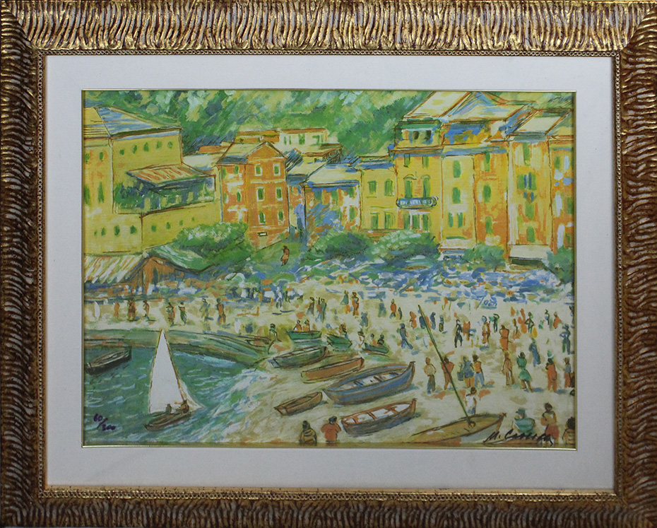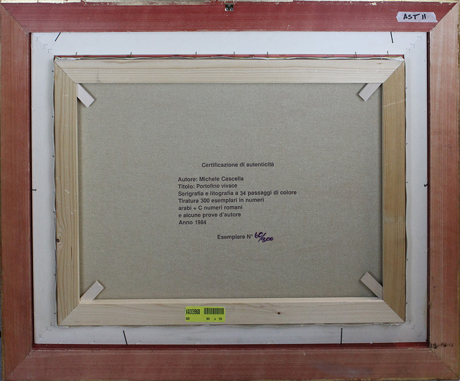 MICHELE CASCELLA, "Portofino vivace", 1984, Serigrafia e litografia 34 passaggi di colore su tela, Dim. 50x70, Al fronte: esemplare 60/300 in basso a sinistra, firmato in basso a destra, Al verso: certificazione di autenticità, Opera con cornice