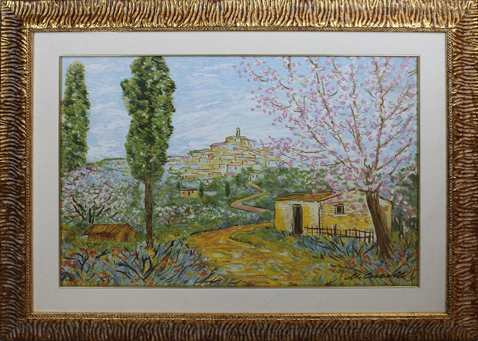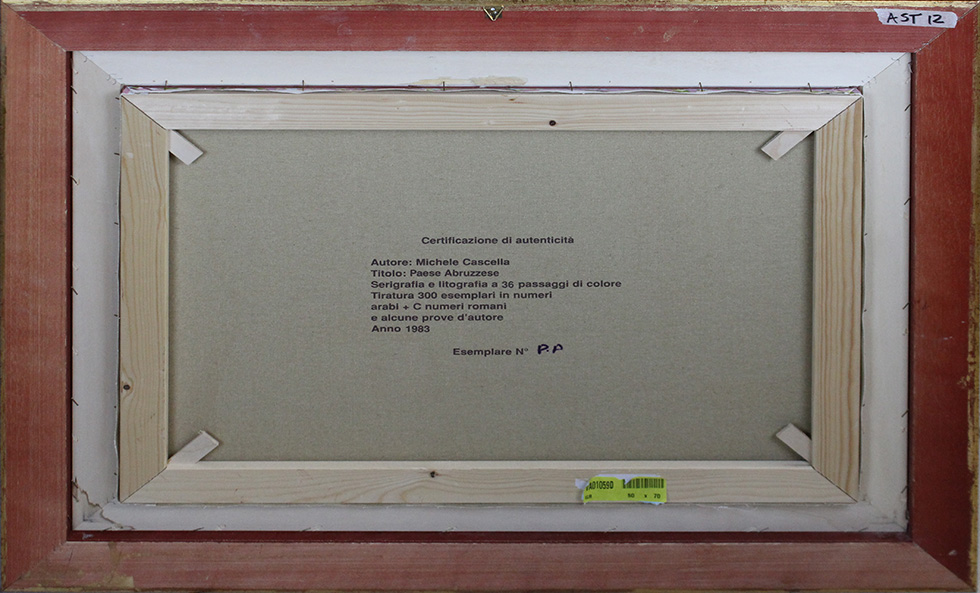 MICHELE CASCELLA, "Paese abruzzese", 1983, Serigrafia e litografia 34 passaggi di colore su tela, Dim. 50x70, Al fronte: Esemplare PA in basso a sinistra, firmato in basso a destra, Al verso: certificazione di autenticità, Opera con cornice