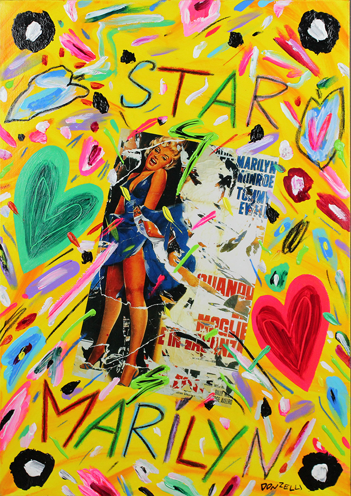 BRUNO DONZELLI, "Star Marilyn", Tecnica mista su tela, Dim. 70x50, Al verso: titolo e firma, Al fronte: firmato in basso a destra