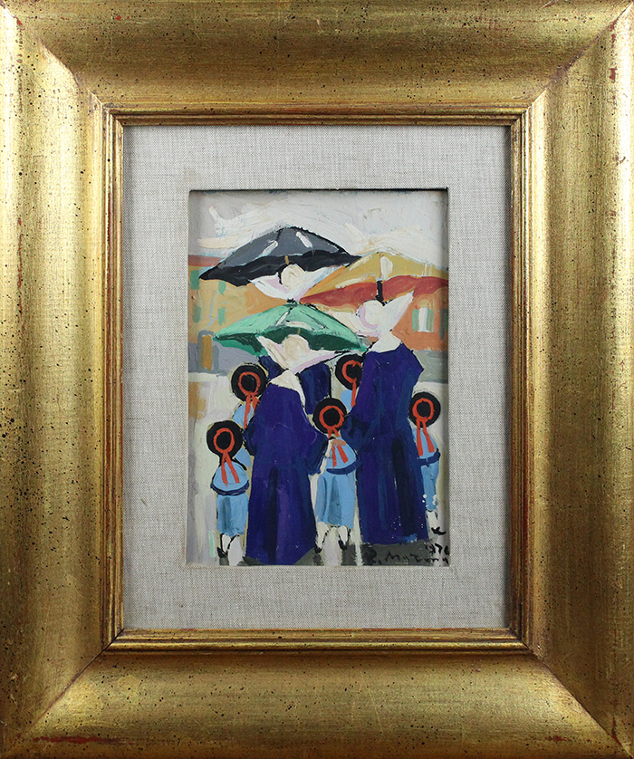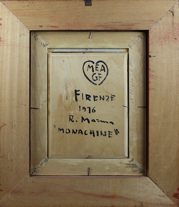 RODOLFO MARNA, "Monachine",1976, Olio su tavola, Dim. 24x18, Al verso: data, titolo, luogo e firma, Al fronte: datato e firmato in basso a destra, Opera con cornice