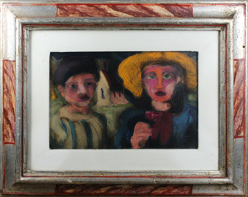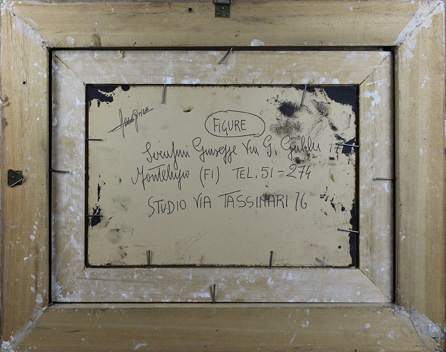 GIUSEPPE SERAFINI, "Figure", Tecnica mista su tavola, Dim. 20x30, Al verso: titolo, firma e dati dell'artista, Al fronte: firmato in basso a destra, Opera con cornice