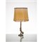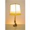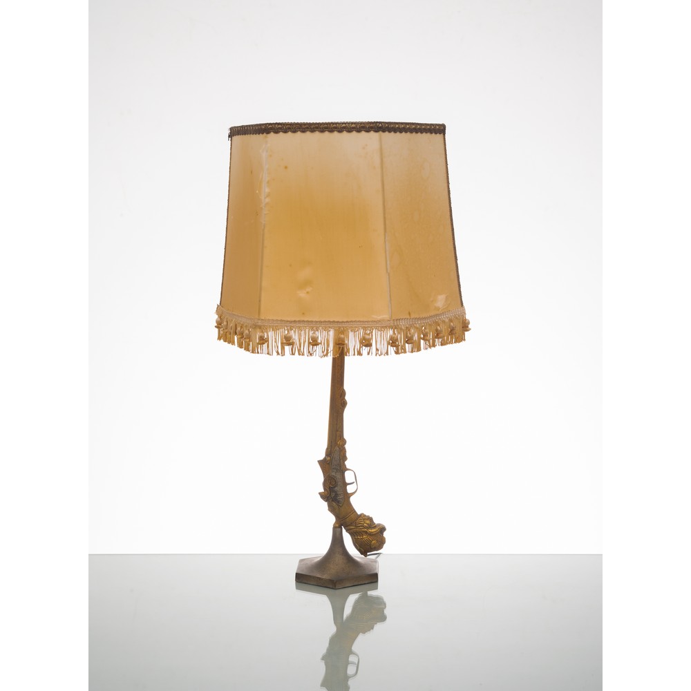 Lampada da tavolo ad una luce, struttura in metallo dorato riproducente una pistola, base esagonale, paralume in tessuto chiaro.